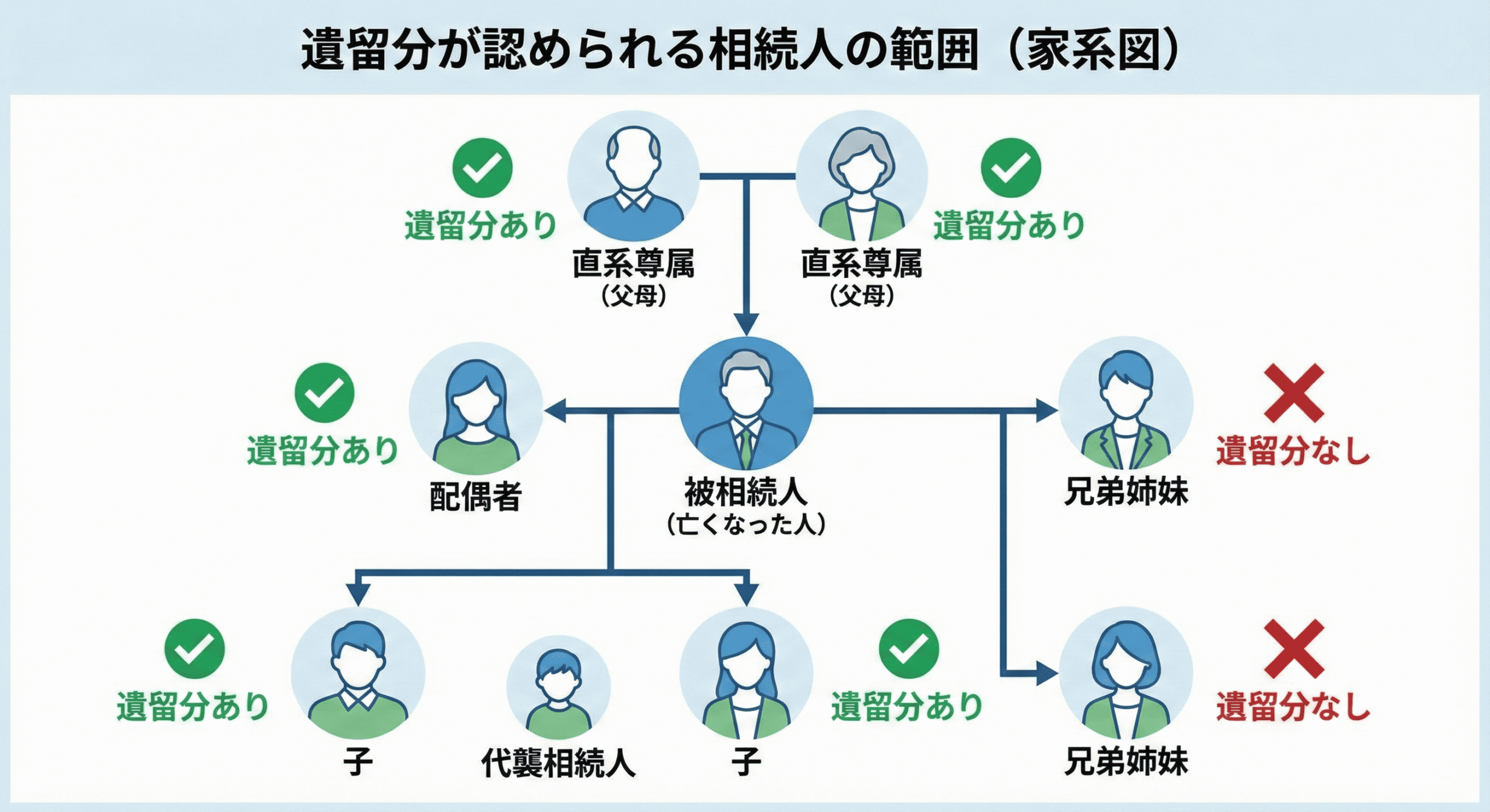 遺留分が認められるのは、すべての相続人ではありません。具体的には、次の相続人に限って遺留分が認められています。