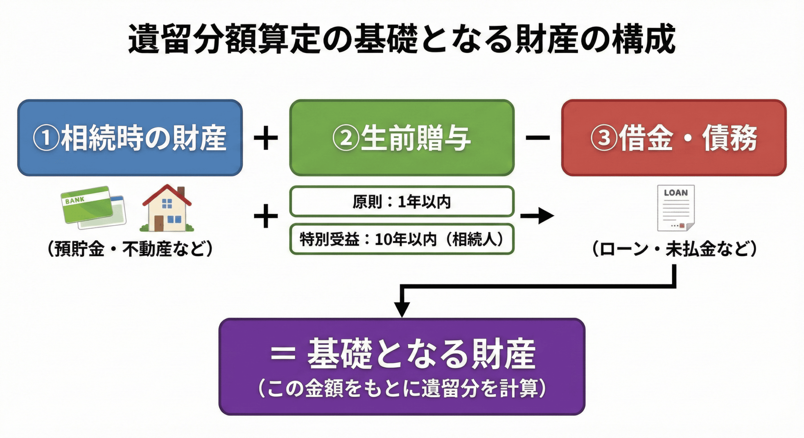 遺留分の計算は、亡くなった時の手元資金だけではありません。「過去のプレゼント(生前贈与)」を足し、「マイナスの財産(借金)」を引く必要があります。計算の全体像はこのようになります。